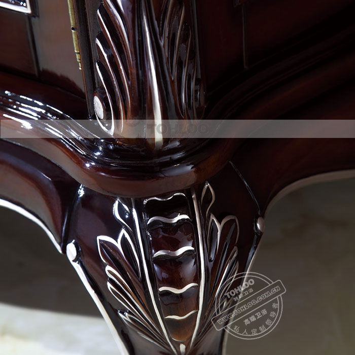 【柜体】:采用进口橡木材料,经过多道工序,6层现代无尘喷漆工艺制作。具体天然环保,防水、防潮、防腐、防蛀等特性,是现代浴室柜里的主流材料之一,总体美观大方。